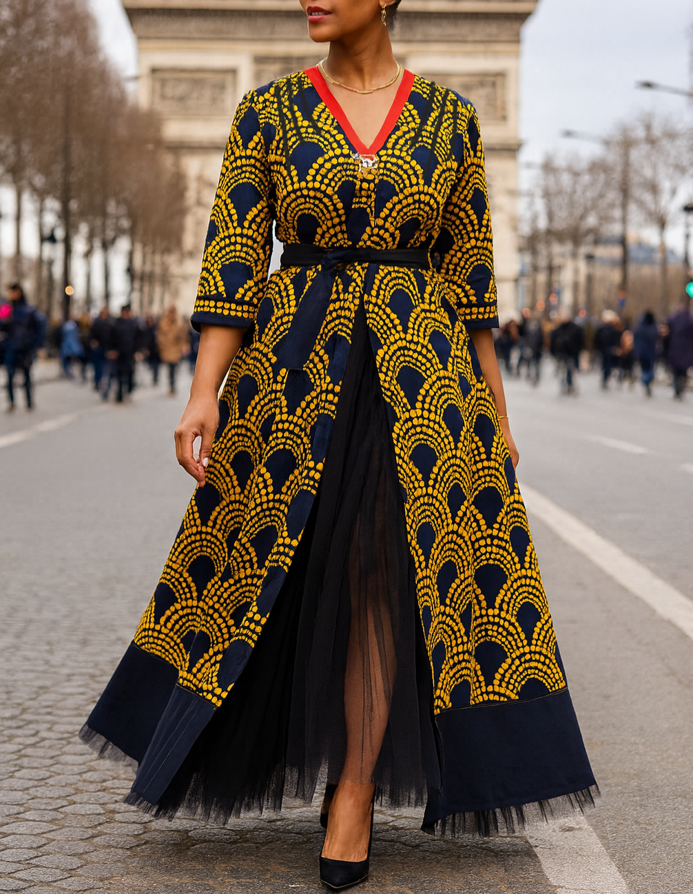 La taille est soulignée par une ceinture à nouer, permettant d’ajuster la robe selon vos envies.