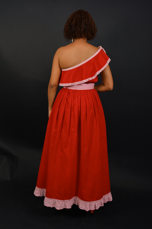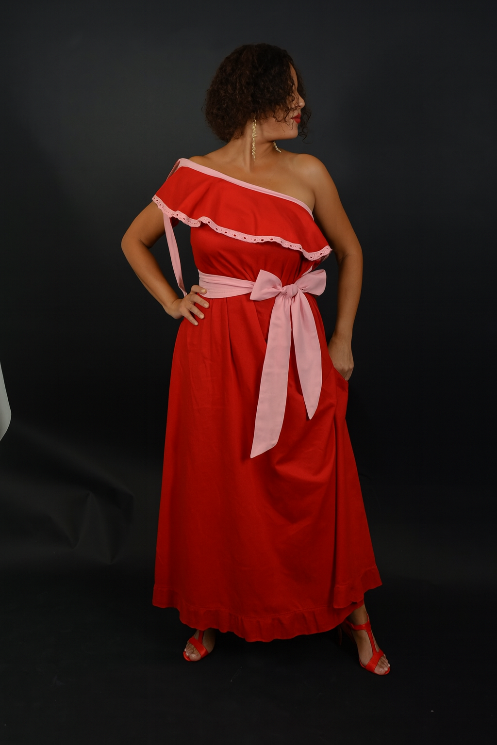 Son design asymétrique, laissant une épaule nue, est souligné par un délicat petit nœud au niveau de l’épaule. Un volant apporte légèreté et féminité à la silhouette, tandis qu’une large ceinture vient marquer la taille.